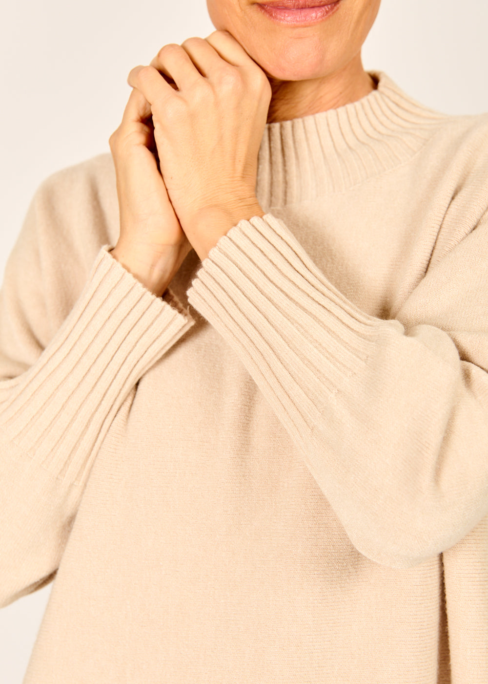 Dieser edle Pullover in strahlendem Avorio (Elfenbein) ist das zeitlose Basic, das in keiner Wintergarderobe fehlen darf. Der dezente Stehkragen mit breiter Rippstruktur verleiht dem kuscheligen Strick einen Hauch von Eleganz und bietet gleichzeitig wohlige Wärme. Sein lockerer, unkomplizierter Schnitt macht ihn zum perfekten Kombinationspartner für alles – von schmalen Hosen bis zu fließenden Röcken.