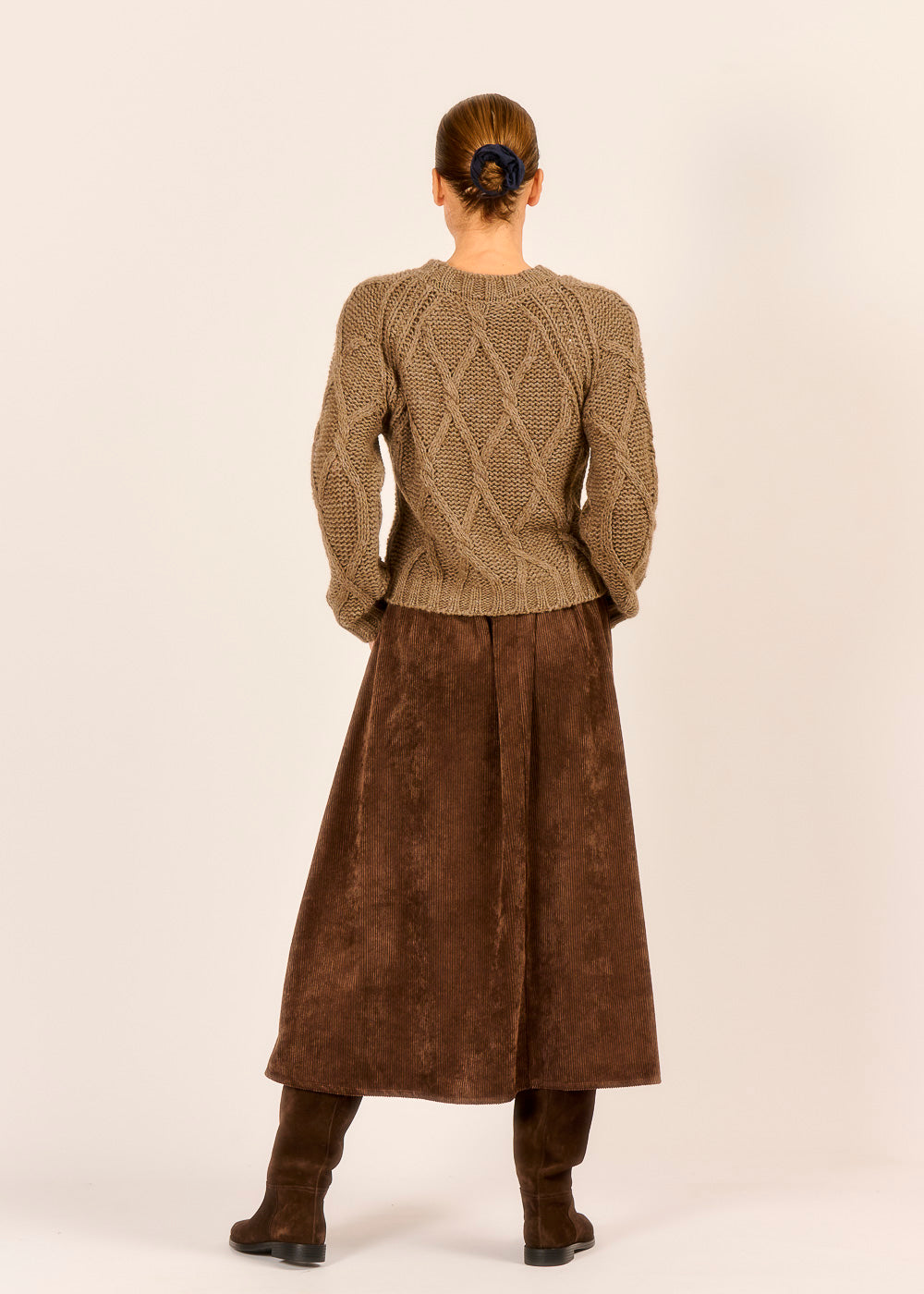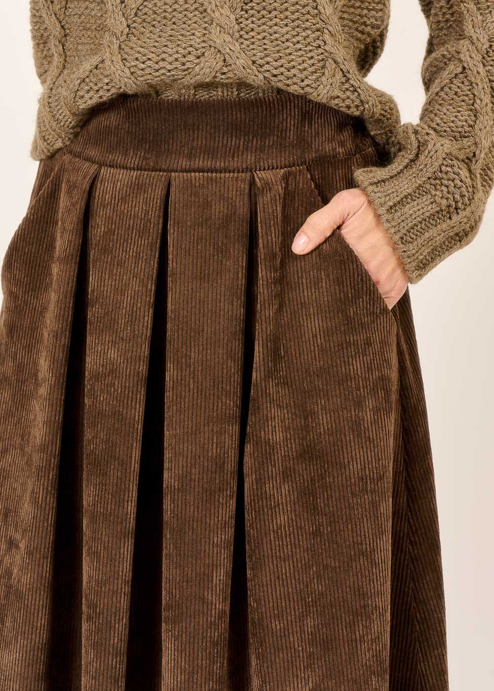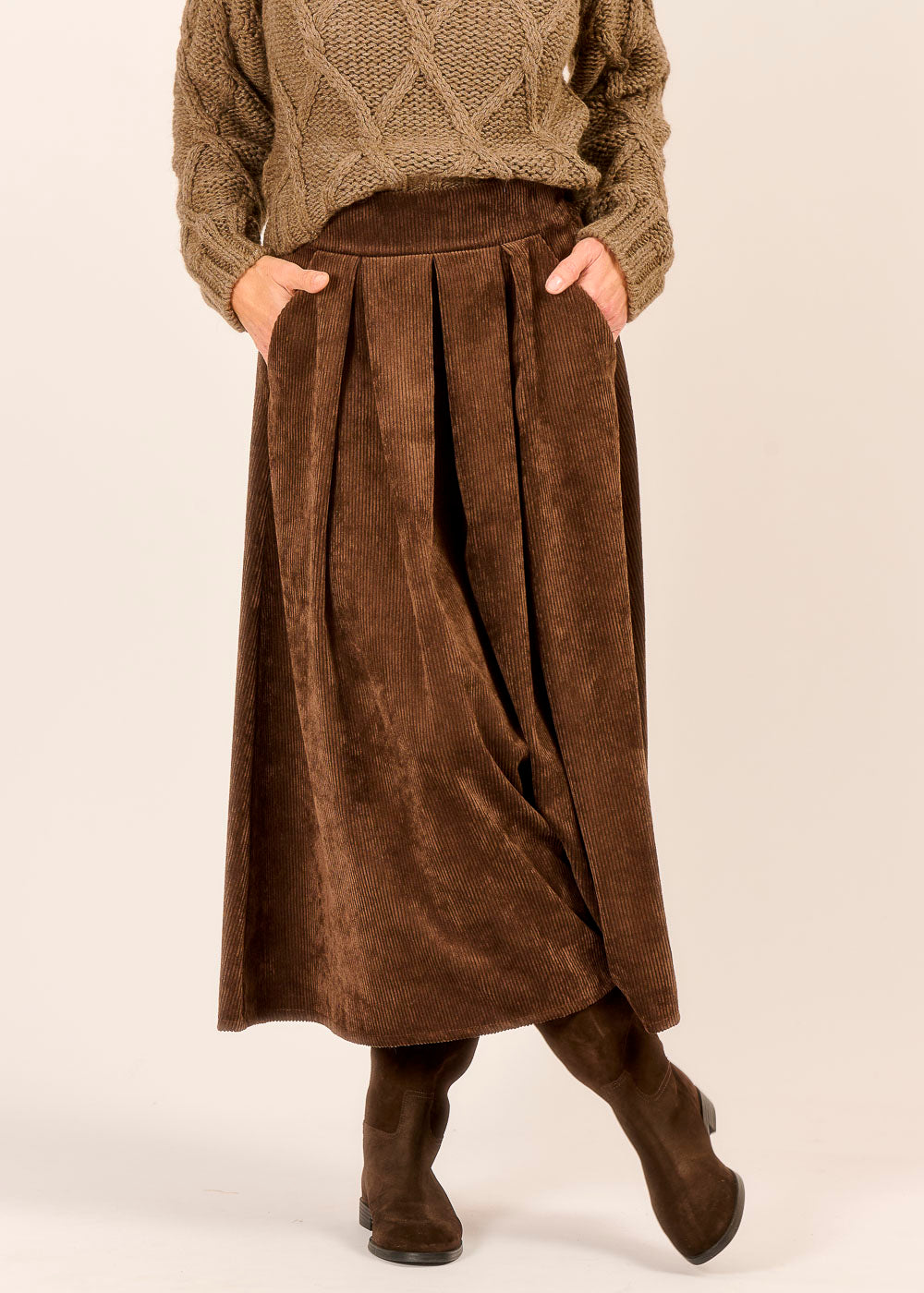 Dieser elegante Maxirock aus weichem Cord in sattem Moka (Dunkelbraun) vereint Stil und Tragekomfort dank der raffinierten Passe vorne und einem bequemen Gummizug hinten. Die modischen, weiten Falten verleihen dem Rock eine feminine Weite und Eleganz, während die praktischen seitlichen Eingriffstaschen Lässigkeit in das Design bringen. Ein wunderbares Key-Piece, das besonders im Herbst und Winter mit Stiefeln und Strickpullovern stilvolle Textur-Akzente setzt.